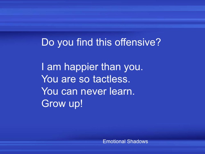When I encounter people who are insensitive, I wonder about the learning and fear that underlies their comments or behavior. To me, their actions are telling of an unhappy worldview, where one’s inner sense of security lies in laying others low. Their words often say something not about me, but about them, and fill me with compassion more than hurt.